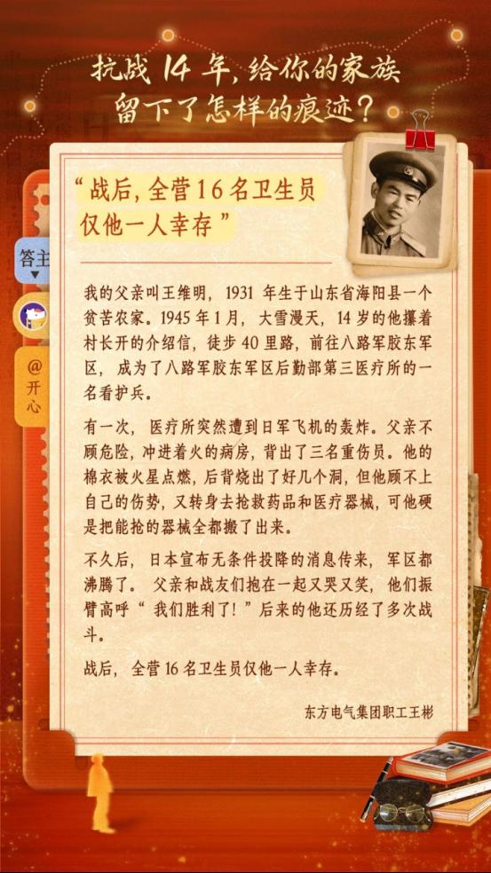 不久后,日本宣布无条件投降的消息传来,军区都沸腾了。父亲和战友们抱在一起又哭又笑,他们用振臂高呼“我们胜利了!”后来的他还历经了多次战斗。战后,全营16名卫生员仅他一人幸存。